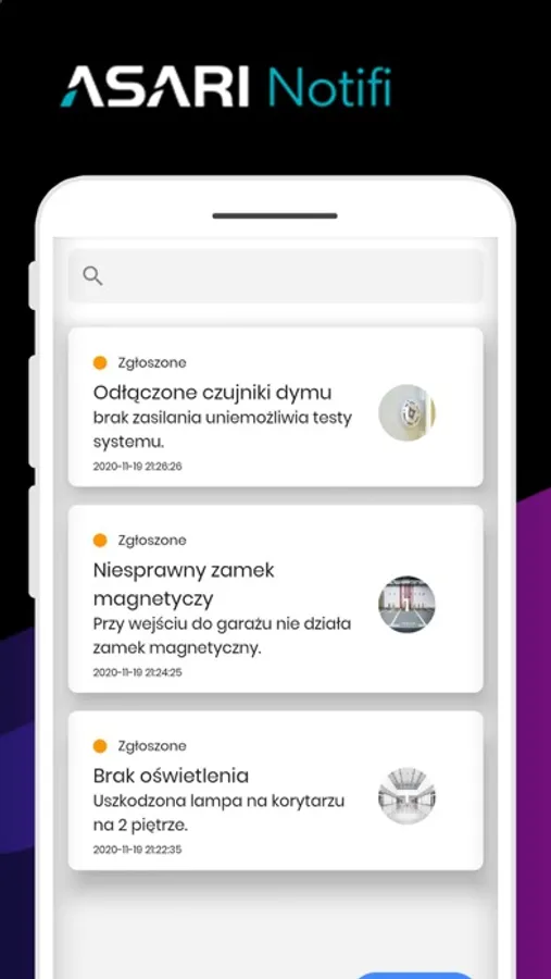 ASARI NOTIFI to aplikacja, której głównym celem jest szybkie wysyłanie wszelkiego rodzaju zgłoszeń i zadań do aplikacji ASARI CRM. Jest skierowana zarówno do firm działających w branży obrotu i zarządzania nieruchomościami, ale i innych, w których tego typu działania są niezbędne. Aplikacja np. może być skierowana do administratorów budynków, zarządców nieruchomości, ale również mieszkańców czy najemców gdzie, występuje potrzeba rejestrowania usterek, napraw lub niezbędnych prac związanych z utrzymaniem nieruchomości w dobrym stanie.