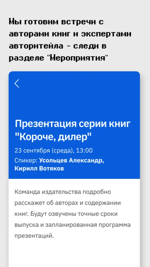 О выпуске новых книг и других важных событиях мы будем оповещать тебя в разделе «Новости». А еще мы готовим встречи с авторами книг, не пропусти такую возможность — следи за обновлениями в разделе «Мероприятия».