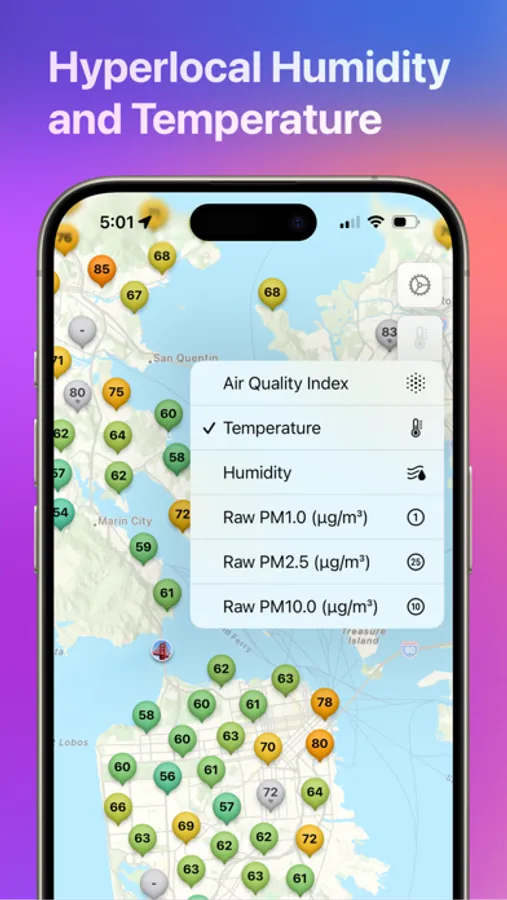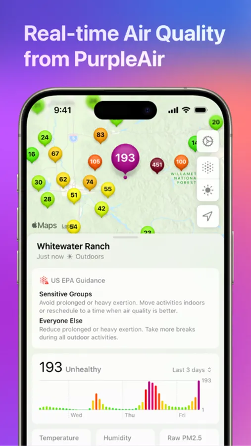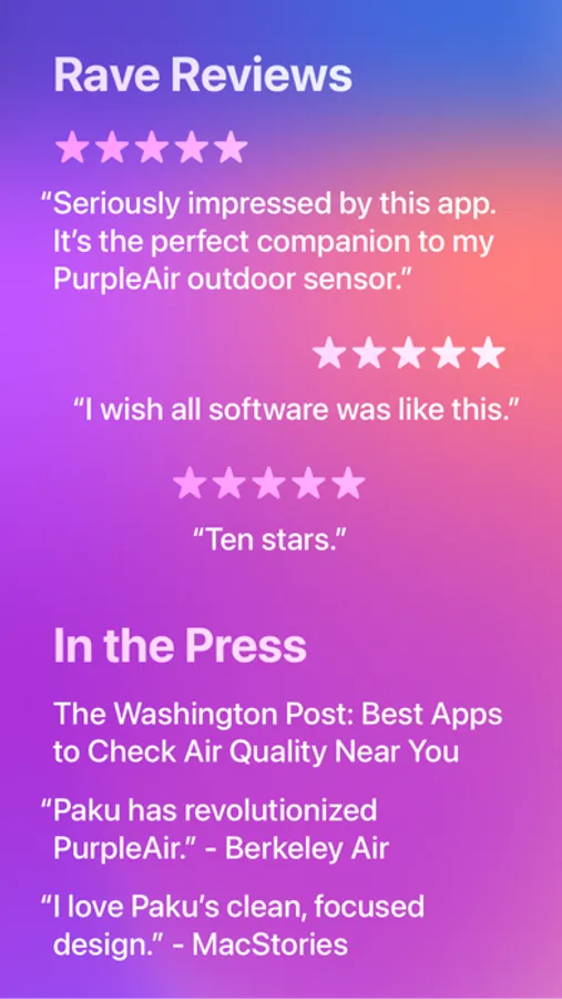 Paku is fast and lightweight. View hyperlocal, real-time air quality, temperature and humidity from PurpleAir sensors, and enable AirNow stations for additional information.