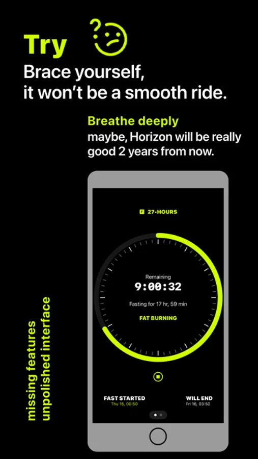 Horizon is intended to be a tool to track intermittent fasting and is not a medical or healthcare service. You should consult a medical professional before starting intermittent fasting or any weight loss program, especially if you are pregnant or suffer from a medical condition.