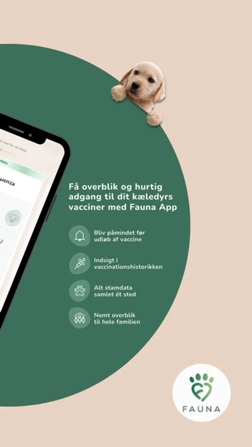 Fauna appen giver et let overblik over konsultationer og behandlinger, herunder lovpligtige vaccinationer, hvor ofte og hvilket medicin dit kæledyr skal have. Derudover får du som kæledyrsejer påmindelser om næste gang du og dit kæledyr skal besøge dyrlægen. Med Fauna er alt dokumentation samlet et sted, så vaccinationskortet aldrig glemmes til fx dyrlæge, på rejser, til arrangementer og pasning.