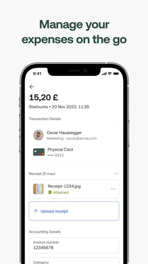 Categorise transactions according to your accounting structure including cost centre, cost unit and VAT rate. Easily attach receipts via the Moss app. And save time and money by simplifying your accounting, with an official DATEV-integration.