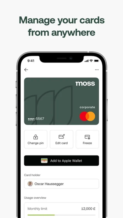 Easily manage your payments and expenses with Moss, a real credit card with real spending power designed for fast growing businesses. In cooperation with a German partner bank, Moss offers a powerful payment management solution that streamlines the spend process for your entire company, and grows as your business grows.
