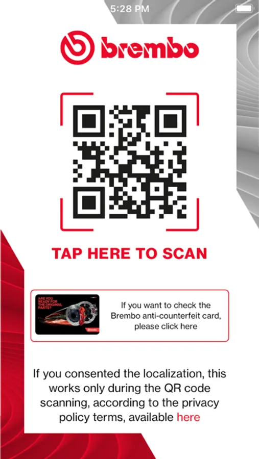The Brembo Check APP allows you to verify easily and quickly, the authenticity of your Brembo products. After installing Brembo Check on your mobile device, you can just scan with your smartphone the QR Code that is present and easily visible on the product or on the box of the Brembo product you bought. You will immediately receive the outcome about the authenticity of the Brembo product.