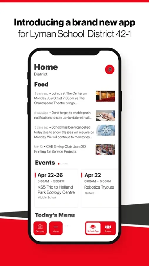 The event section shows a list of events throughout the district. Users can add an event to their calendar to share the event with friends and family with one tap.