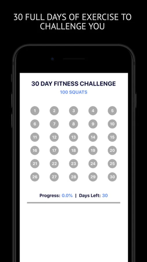 30 Day Fitness - 100 Squats is a fitness challenge that challenges you to achieve 100 squats without taking a break on day 30.