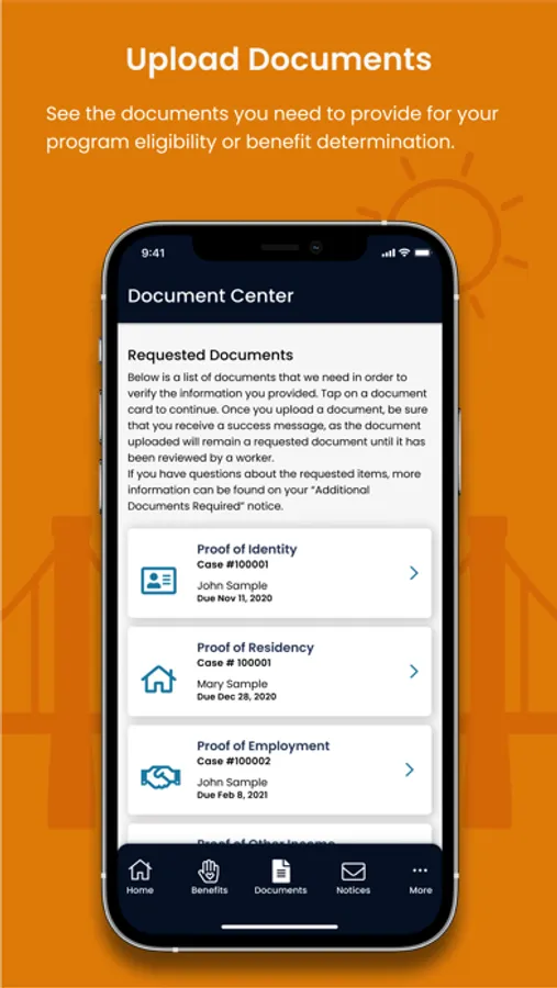 SUBMIT DOCUMENTS See the documents you need to provide for your program eligibility or benefit determination. You can upload documents using your phone’s camera, photo gallery, or a PDF.