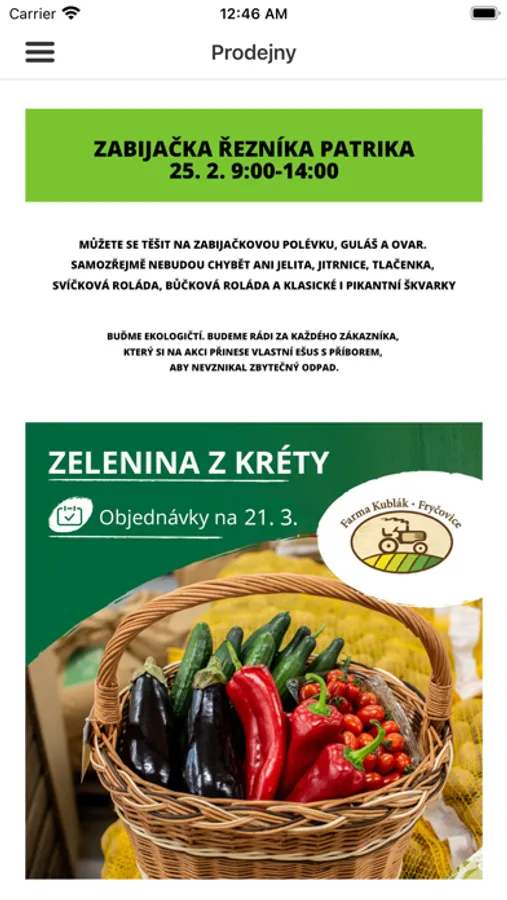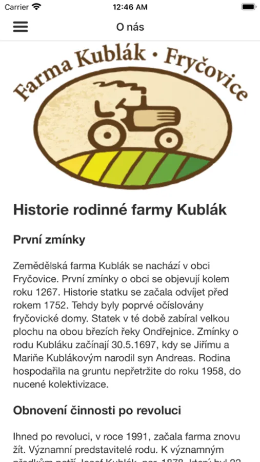 Aplikace Farma Kublák Fryčovice poskytuje důležité informace o farmě. V aplikaci naleznete sortiment farmy či kontakty na prodejny. Aplikace obsahuje informace, jak nakupovat, přihlášení a registraci do velkoobchodu.
