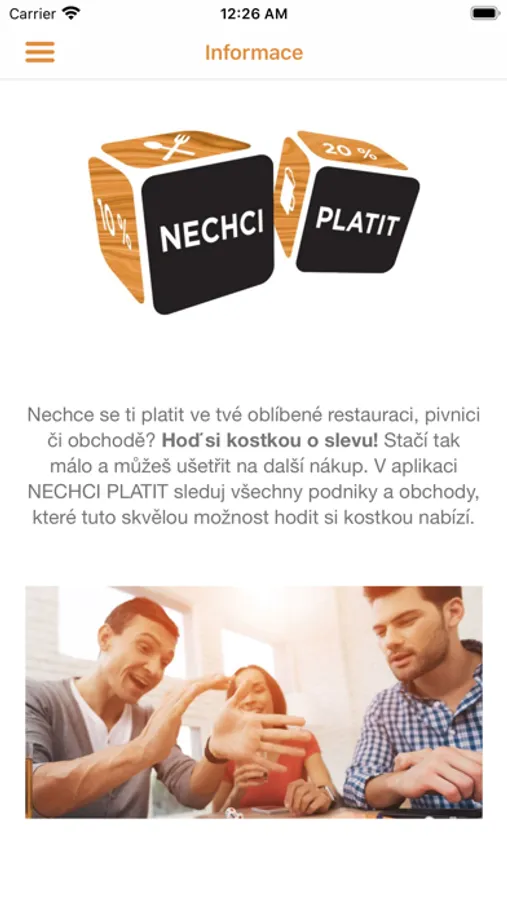 Nechce se ti platit ve tvé oblíbené restauraci, pivnici či obchodě? Hoď si kostkou o slevu! Stačí tak málo a můžeš ušetřit na další nákup. V aplikaci NECHCI PLATIT sleduj všechny podniky a obchody, které tuto skvělou možnost hodit si kostkou nabízí.
