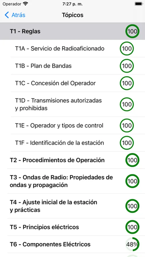 Vea su competencia para cada uno de los temas que estudia. XE Ham Test realiza un seguimiento de su competencia para que siempre sepa cómo lo está haciendo.