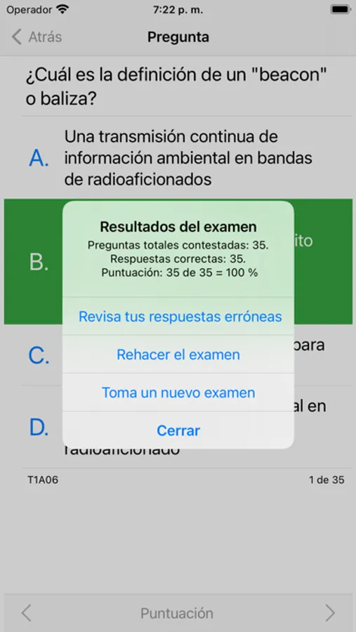 Cuando selecciona una respuesta incorrecta, XE Ham Test le muestra la respuesta correcta.