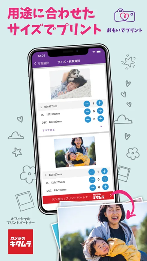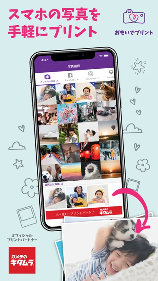 Easily select your photos from your device, select the quantity and have them printed at your nearest Kitamura store. Perfect if you are looking for a popular smartphone app that allows you to easily order photo prints from home.