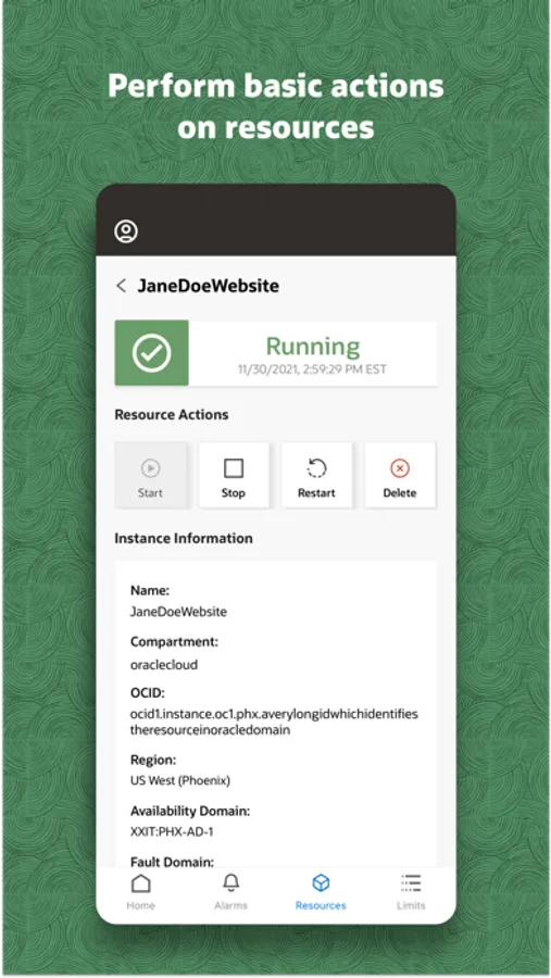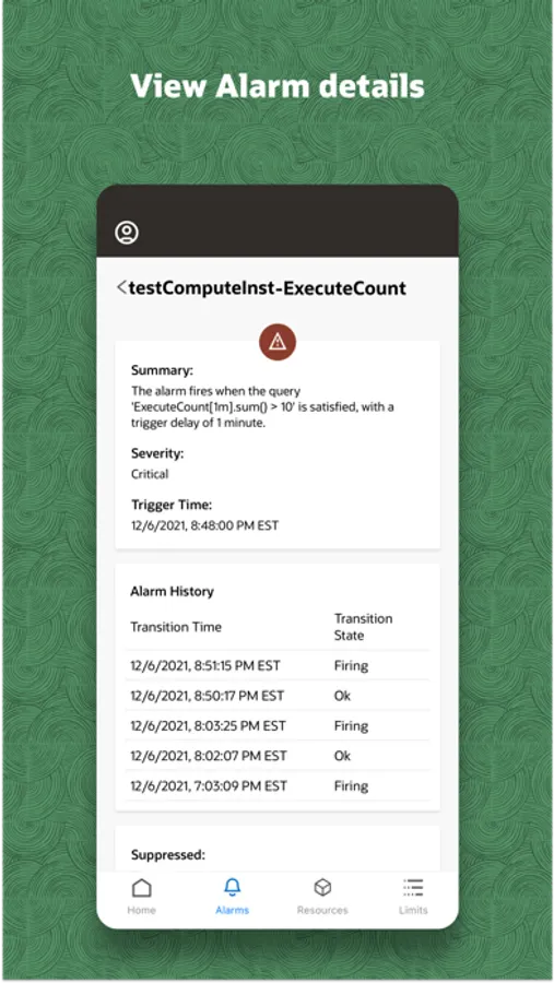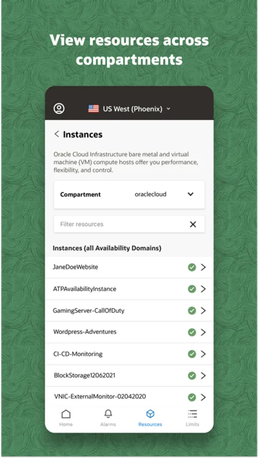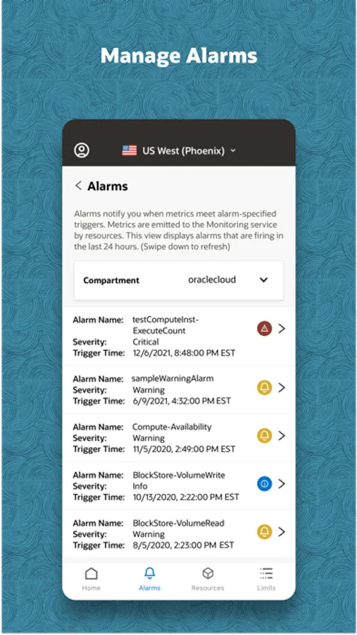 The Oracle Cloud Infrastructure Mobile App lets customers review alerts, notifications, and limits on-the-go. Quickly access information about infrastructure resources, billing, and usage data from your Apple devices. Use the mobile app to see: