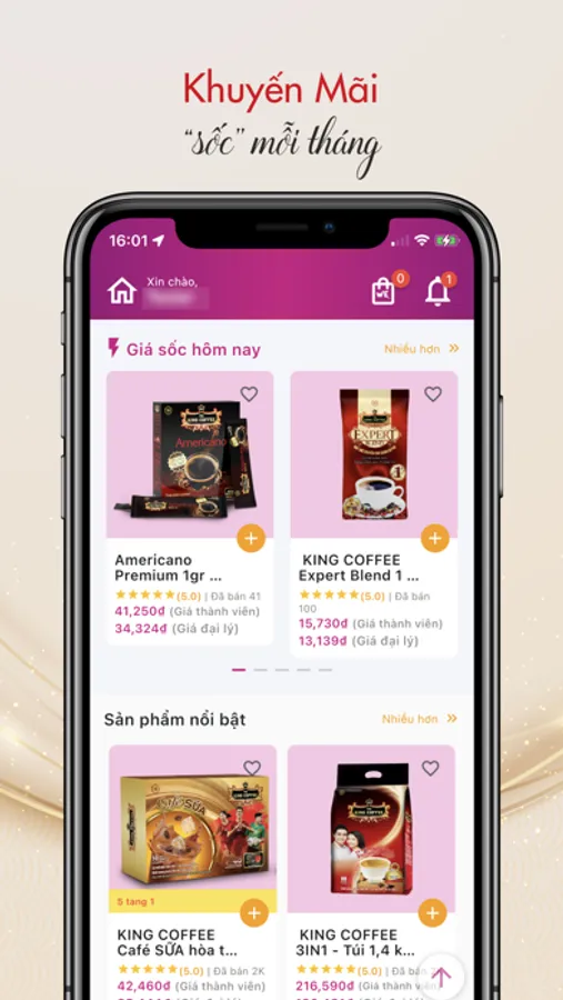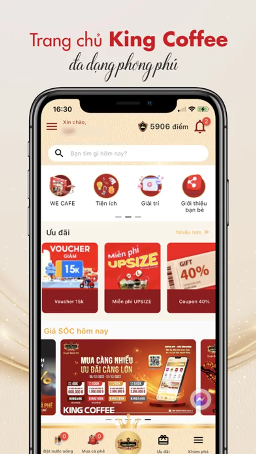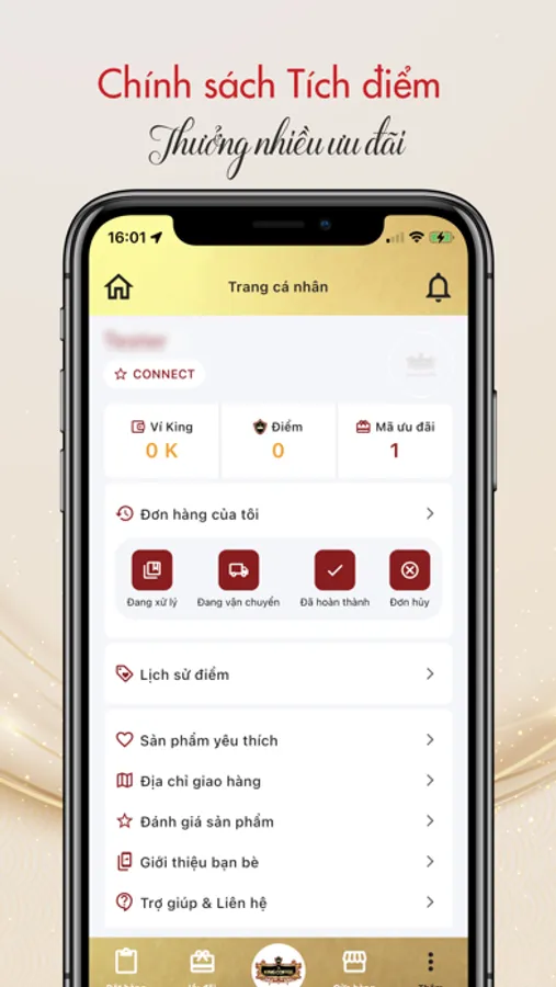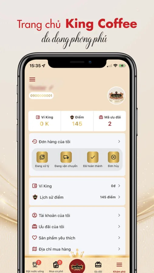 Chỉ với một tài khoản King Member trên super app KING COFFEE, bạn có thể vừa mua sắm, vừa kinh doanh và tích luỹ King Point để nhận thêm nhiều ưu đãi hấp dẫn khác.