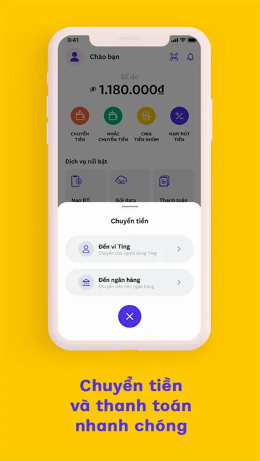 Quy trình chuyển tiền được đơn giản hoá và đảm bảo an toàn tuyệt đối. Bạn có thể chuyển tiền tới tài khoản ví Ting dễ dàng bằng cách sử dụng tính năng Chuyển tiền, scan QR code.