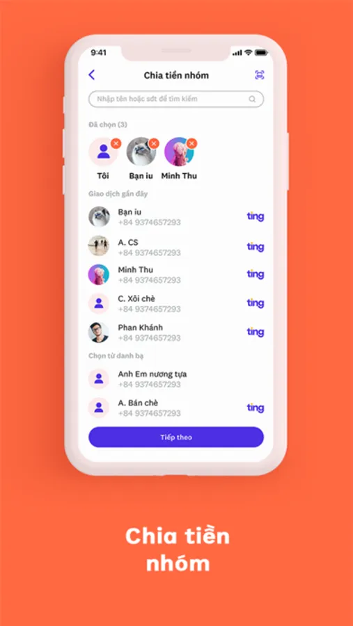 Đi ăn với nhóm bạn và bạn đại diện nhóm thanh toán nhưng về cần chia lại hoá đơn? Ting giúp việc chia sẻ hoá đơn được dễ dàng hơn bằng tính năng chia tiền nhóm. Sau khi chia tiền, bạn có thể dễ dàng nhận/chuyển tiền ngay trên ứng dụng Ting – không cần phải lo lắng về việc ai nợ ai bao nhiêu nữa.