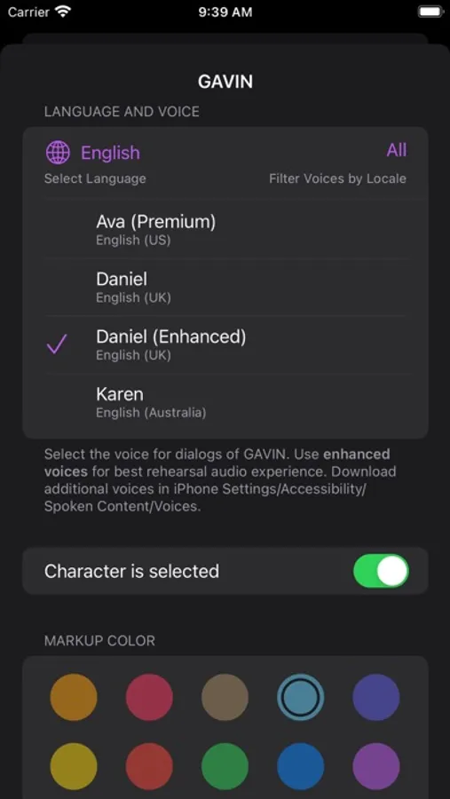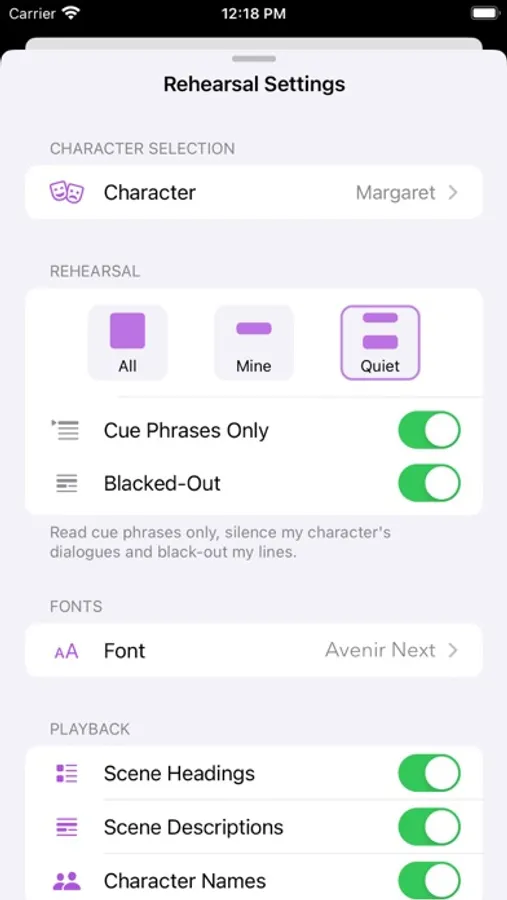 Script Buddy can read the entire script or specific parts. Black-out and silence your lines and let Script Buddy read the rest of the script aloud.