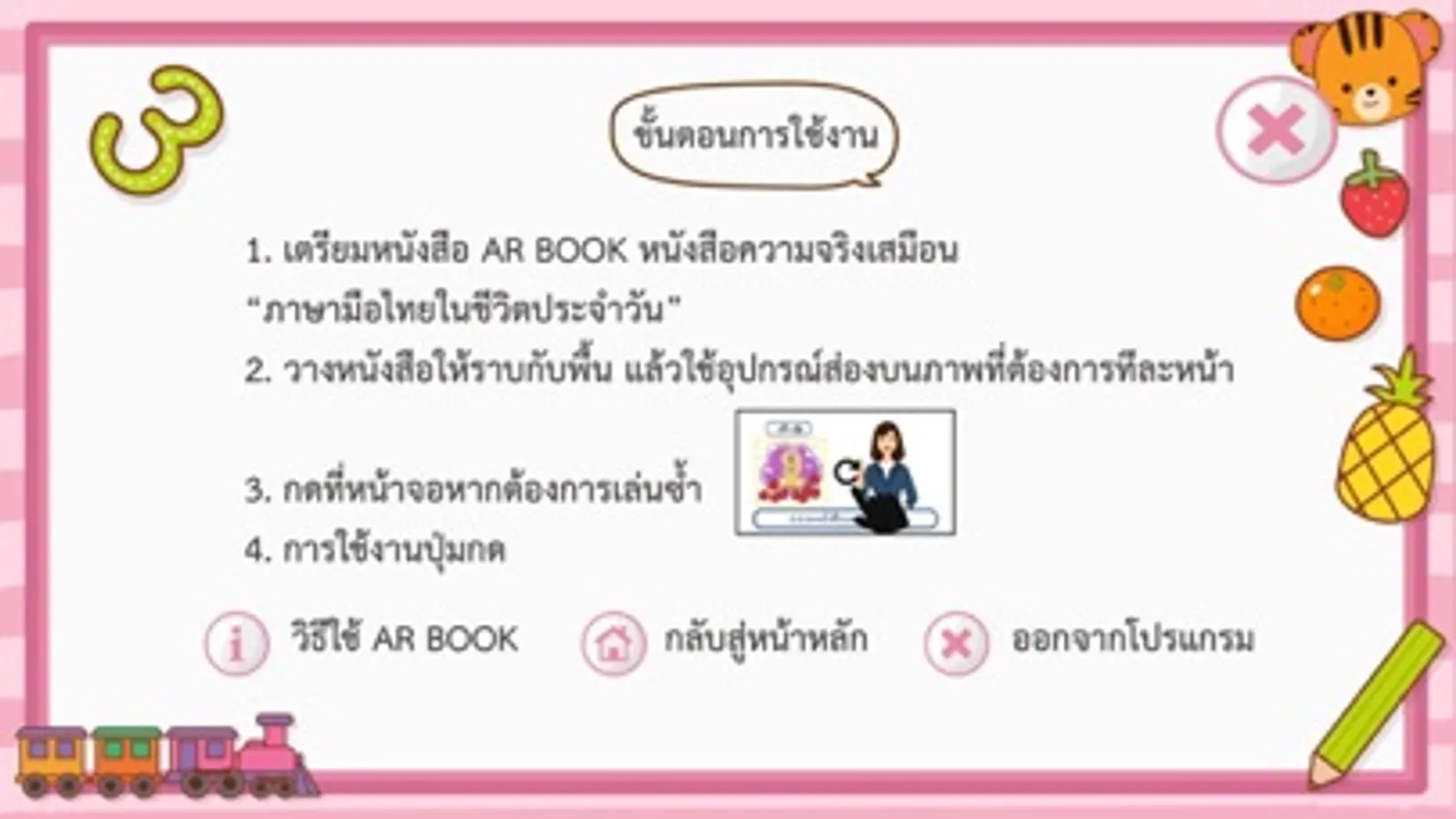 AR ภาษามือไทยในชีวิตประจำวัน : เป็นสื่อการสอนที่กระตุ้นการเรียนรู้และส่งเสริมการเรียนรู้ด้วยตนเองผ่านเทคโนโลยีสมัยใหม่ โดยทำให้ผู้เรียนสนุกกับการฝึกภาษามือ โดยใช้เทคโนโลยีเสมือนจริง (Augmented Reality : AR) ทำให้สามารถเรียนรู้ ฝึกฝนทักษะ ทบทวนและดูซ้ำได้ตลอดเวลาไม่จำกัด เหมาะสมกับผู้เรียนทุกเพศและระดับชั้น ผ่านแอปพลิเคชั่น “AR ภาษามือไทยในชีวิตประจำวัน”