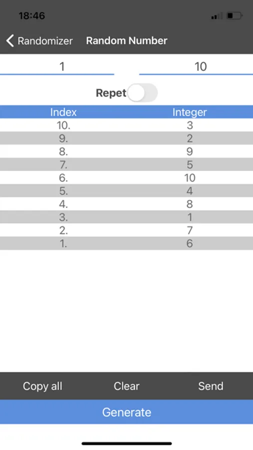 Generate random numbers in any range. It is possible to disable repetitions of random numbers. All random numbers are added to the list and numbered.