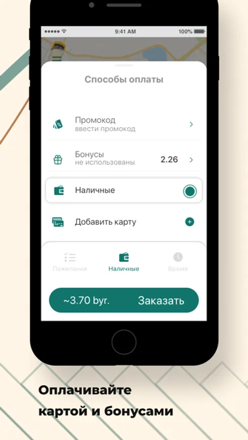 Оплачивайте поездки наличными, картой или накопленными бонусами.