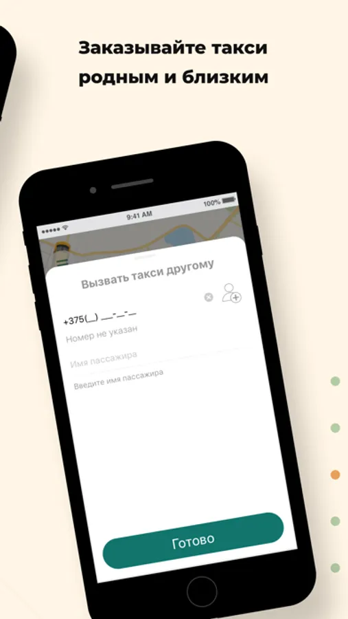 Используйте опцию “Вызвать такси другому” в разделе “Пожелания” и укажите его номер телефона. Когда такси подъедет, на указанный номер придет СМС, а вам — сообщение в приложении.