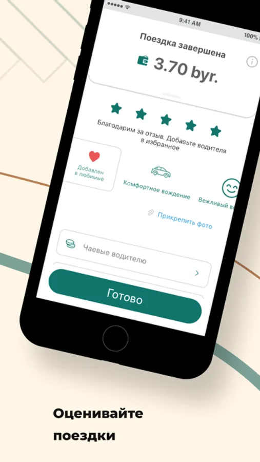 Поставьте оценку водителю, напишите отзыв или выберите реакцию из готовых шаблонов. Прикрепите фотографию к отзыву, оставьте чаевые или посмотрите детализацию платежей после поездки.