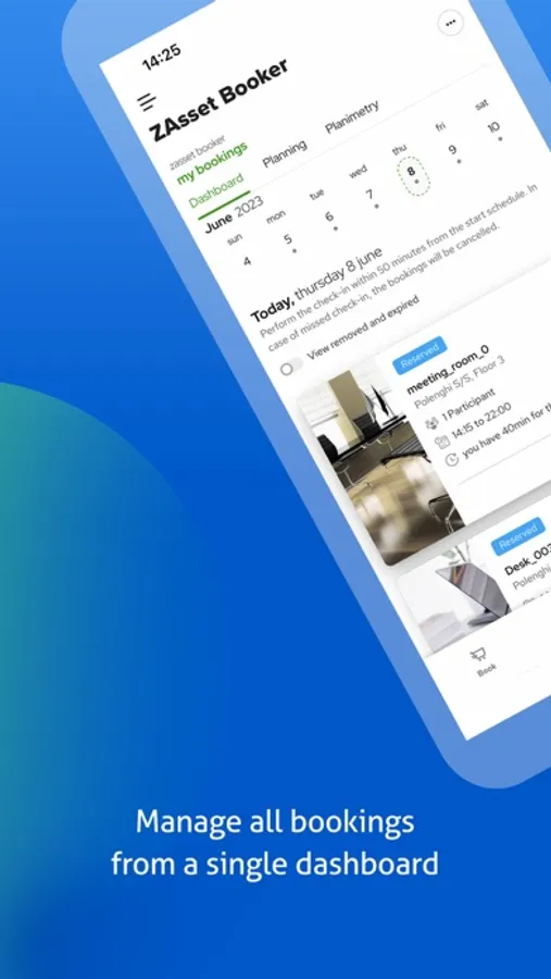 All bookings, both current and future, are summarized in the app’s dashboard; for each booked resource, it is possible to read descriptive information and display the related location on the company's floor plan.