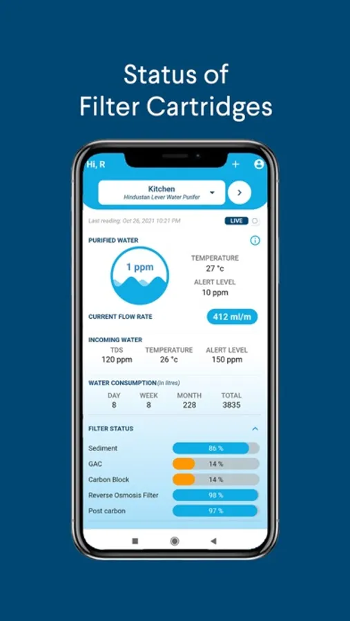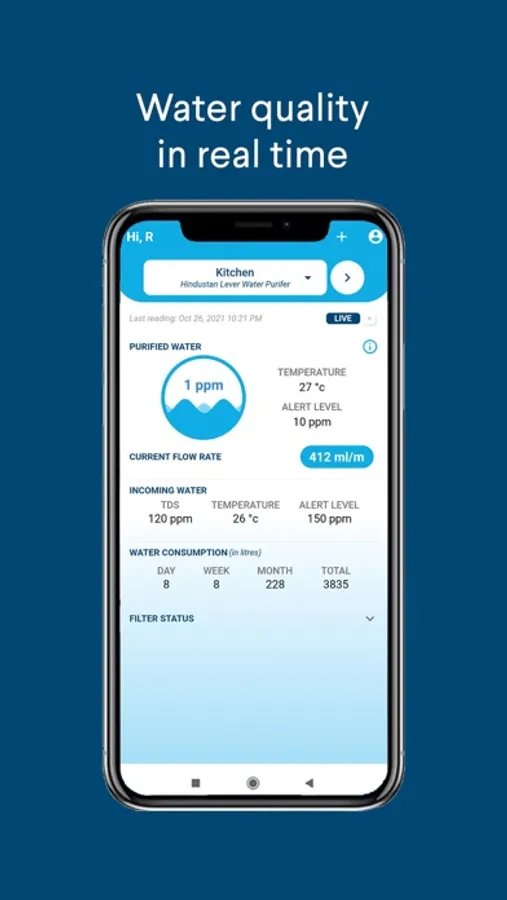 TDSBot tracks incoming and purified water TDS (ppm), temperature, volume of water filtered and its flow rate in your reverse osmosis water filter system. It provides you with real time quality of water, total water filtered, and status of filter cartridges. It notifies you about water quality, leaks, blockage, abnormal temperature and predictive filter maintenance alerts so that you can proactively take action to ensure that your system runs efficiently and ensure good potable water always. Visualize system dashboard, device setup, configure alerts using the free app.