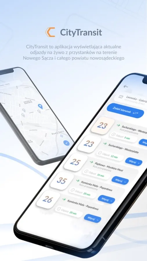 CityTransit to aplikacja wyświetlająca aktualne odjazdy na żywo z przystanków MPK na terenie Nowego Sącza i całego powiatu nowosądeckiego. Wystarczy wyszukać przystanek na dostępnej liście lub wybrać go z mapy, a aplikacja pokaże Ci najbliższe autobusy, które z niego odjeżdżają.