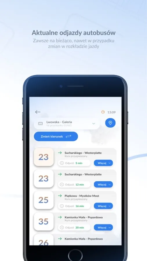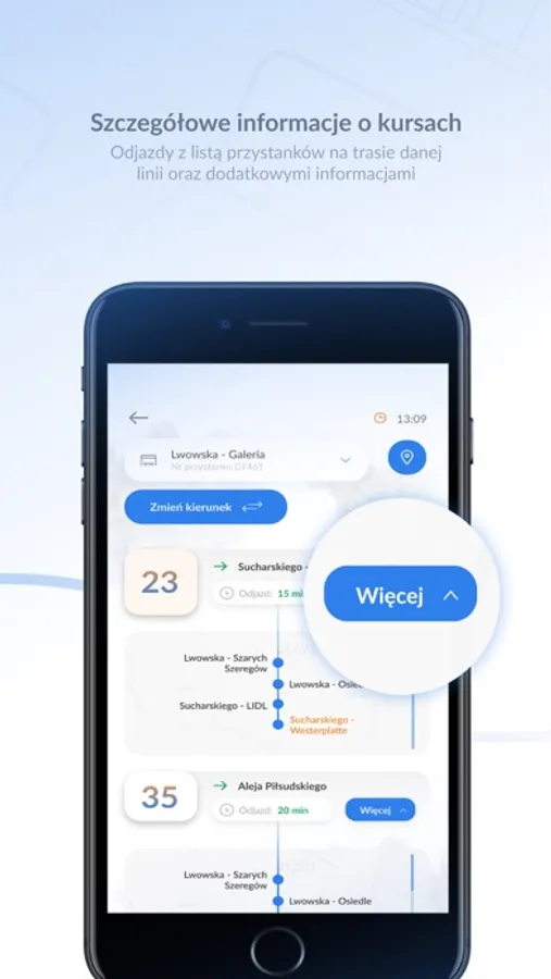 Odjazdy z pełną listą przystanków na trasie danej linii oraz informacją o np. skróconym kursie.