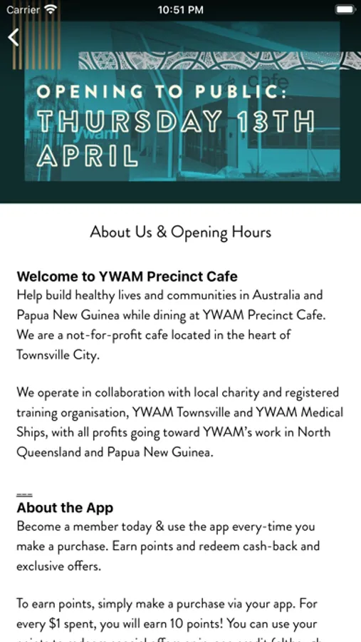 Earn points for every purchase at YWAM Precinct Cafe and start enjoying the benefits of our membership program today. We tailor rewards just for you. Choose when and how to make the most of our promotions.