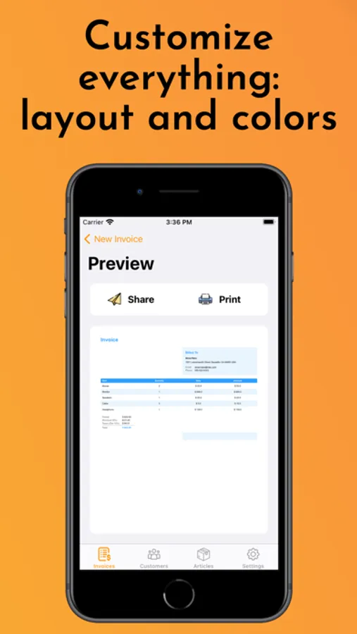 You have every application feature without any ads to be used to create up to 5 invoices with 5 professional layouts and unlimited customers for Free