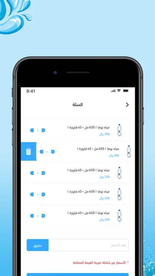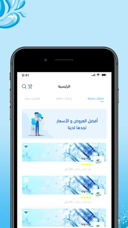 تطبيق قطرات يضم العديد من أنواع المياة المختلفة حيث يمكن للعملاء تحديد المنتجات المفضلة واستكمال عملية الشراء واختيار نوع الدفع سواء مدى او كريديت كارد او كاش، ويتم استلام الطلبات من مندوبينا خلال الوقت المحدد وبأفضل جودة.