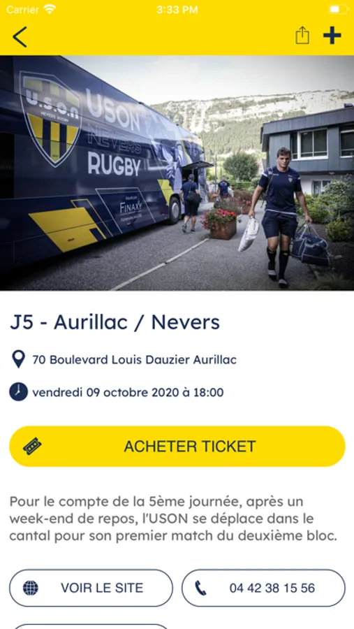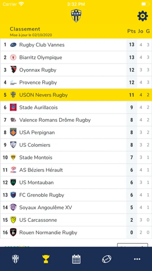 - le suivi live score du match de votre équipe à domicile ou à l’extérieur directement depuis l’application incluant le suivi des actions (essais, pénalités, changements de joueurs, cartons, …).