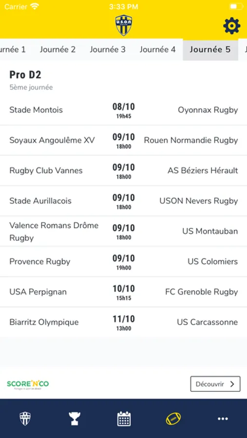 - les matchs de toutes les journées du championnat de Pro D2 avec suivi des scores ;