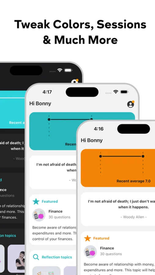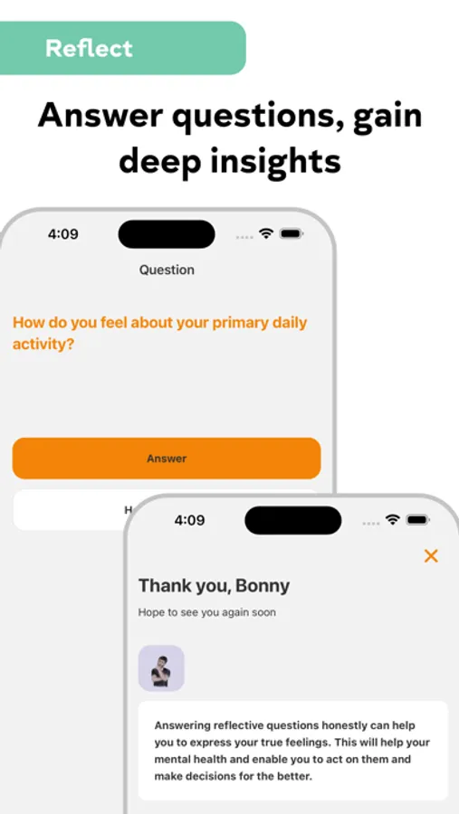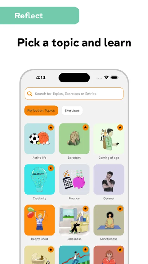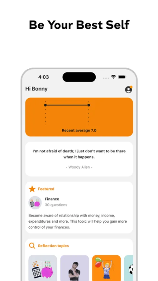 Luci contains a wide selection of topics for you to reflect on. Simply choose a topic and answer a few questions. Feeling stuck? We offer help as you seek the answers that rest within. At the end of each session you will see a nice tip based on the topic you reflected on.