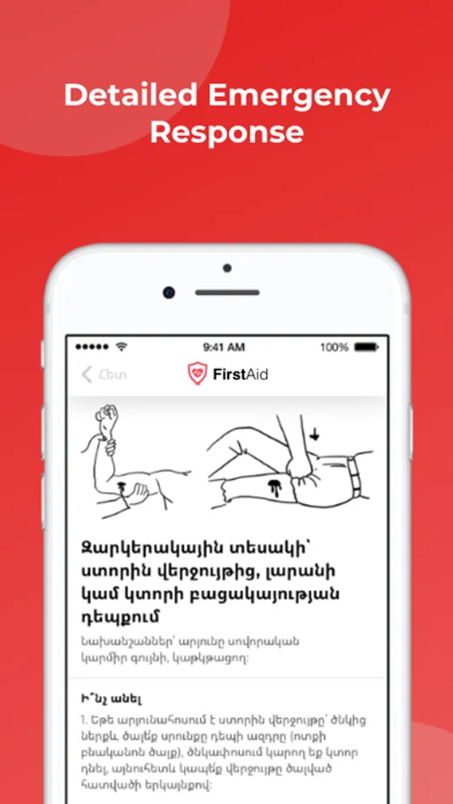 First Aid GuideSimple free offline First aid guide in Armenian to help users handle emergency situations like bone fracture, bleeding, and general emergency. Our first aid guide is a simple and comprehensive collection of tips in Armenian that you can use to resolve or prevent the worsening of emergency situations like bone fracture, bleeding, and general emergency. Detailed descriptions of emergency situations and step-by-step first aid tips. Get instant access to essential first aid instructions from anywhere. App content: Circulatory systemMusculoskeletal systemWound care suppliesComing soon: Cardiopulmonary resuscitationA foreign body in the airwaysOther casesPerforming first aid can save lives and can prevent dangerous conditions during emergencies before medically trained professionals arrive. Disclaimer: Our guide includes only first aid instructions and in no way can replace medical treatment from a professional. Based on videos from 2016 First aid courses by Spartak Hovhannisyan and Emergency Risk Reduction National Platform‘s “First Aid Basics” book.