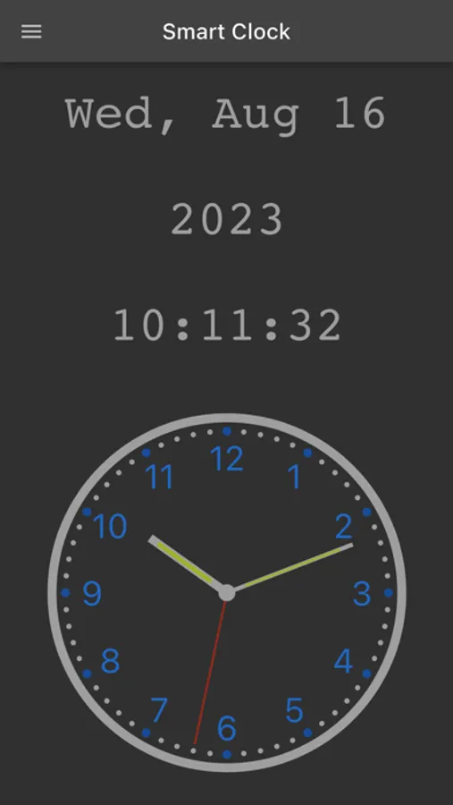 This elegant clock app shows the current time with both digital and analog displays. The analog clock features a smooth-moving second hand for precise timekeeping, while the digital display shows the date, day of the week, and time in an easy-to-read format.
