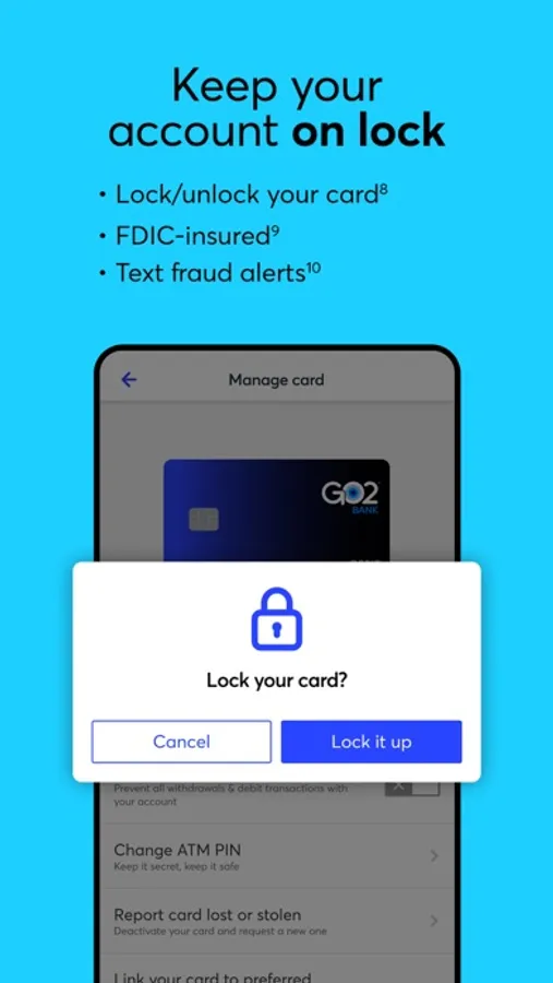 Keep your money safe with just a tap on the app with lock/unlock your card⁸. And we'll send fraud alerts if we ever see anything shady¹⁰.