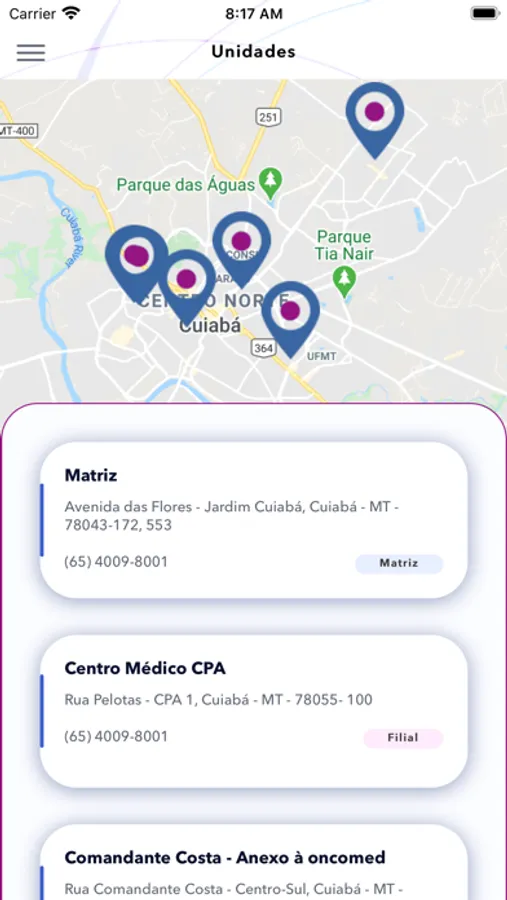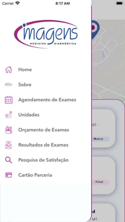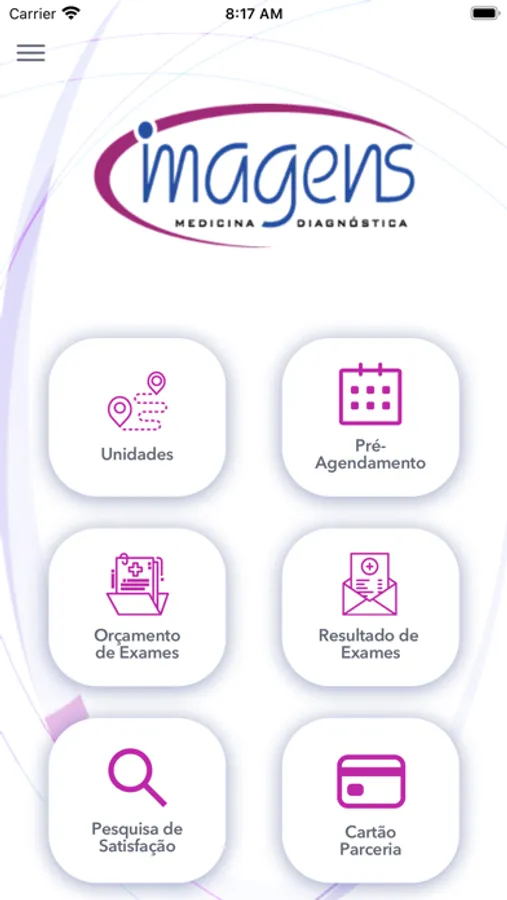 Aplicativo da Imagens Medicina Diagnóstica, neste aplicativo você poderá localizar as unidades, solicitar um pré-agendamento de exames, fazer a pesquisa de satisfação e visualizar o Cartão Parceria.