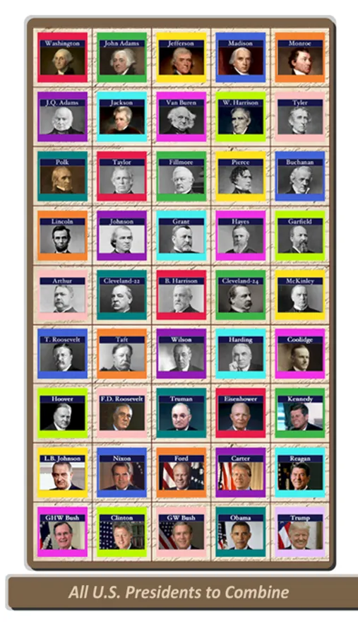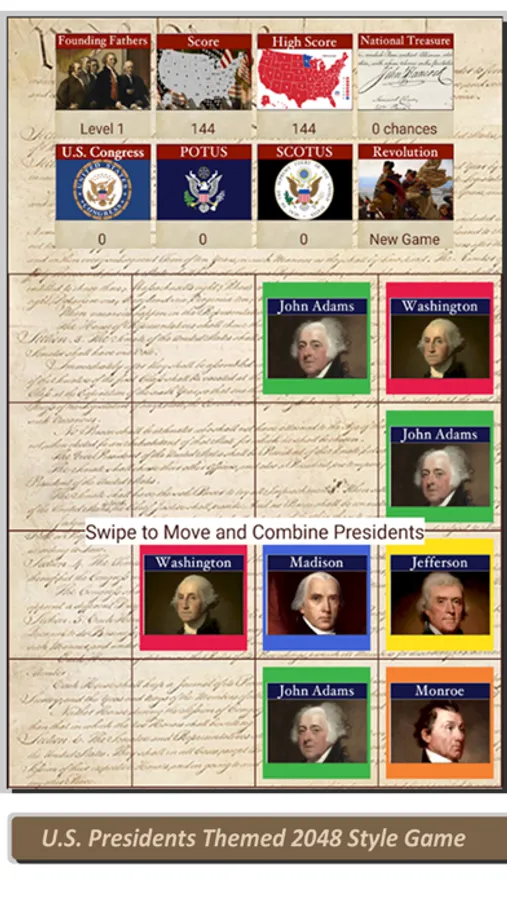 POTUS 2048 is a variation of the popular 2048 style tile game, using images of all the U.S. Presidents for the tiles and extending the rules for a more challenging and exciting 2048 experience! The game is educational; you can tap on president tiles to see fun and interesting facts about each president, creating a fun brain teasing puzzle with interesting historical facts, and learning each president of the United States, in order, from George Washington, POTUS #1, through all historical eras, to the modern presidents of our day.