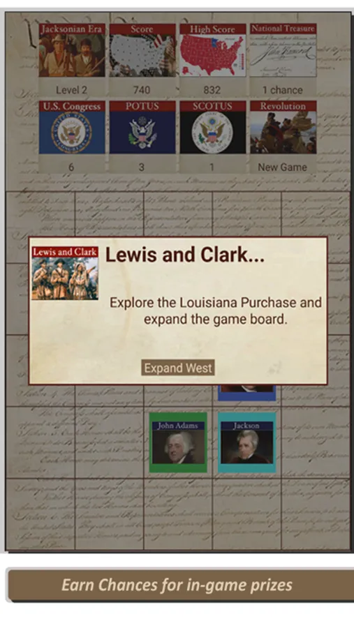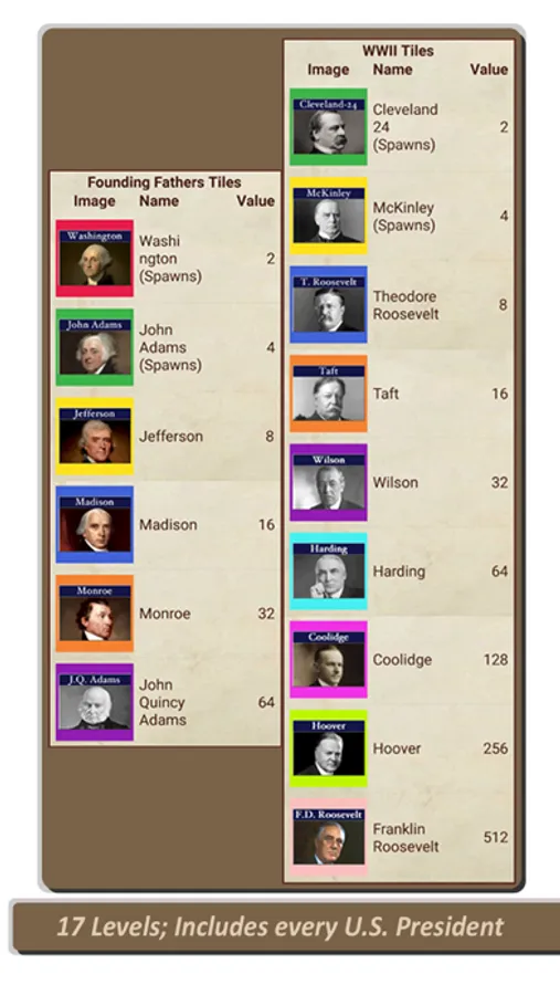 There are 17 levels of U.S. historical eras. Advance through the historical eras to higher value presidents, earning awards along the way, and building a higher and higher score, possible surpassing the highest score. As you advance from one level to the next you gain more bonus powers and even chances to use the National Treasure. Use these National Treasure chances to get more powers and perhaps, if you are lucky, win the Louisiana Purchase that increases the game board size to 5x5 or even bigger.