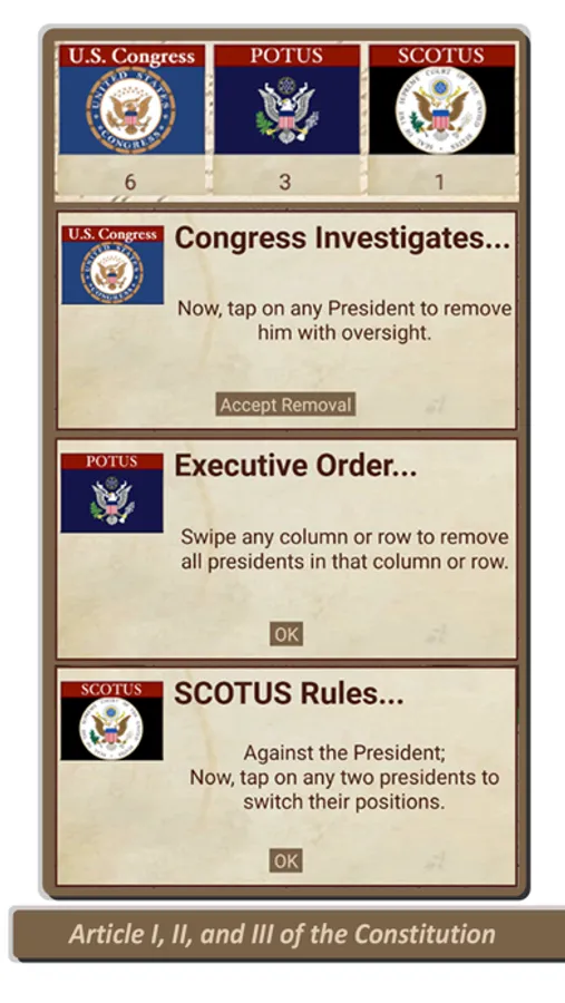 Are you ready for the fun of the classic 2048 puzzle game with the added excitement and strategy of earning constitutional checks on executive power and using them to remove presidents and even switch president positions on the game board? Are you ready to advance through 17 levels of U.S. historical eras, advance through all U.S. presidents and win the Game? Are you ready to play three levels of 2048 and one level of 4096 to win and reach the end of the game?