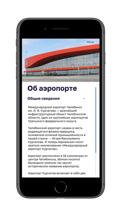 Пилотная версия мобильного приложения Международного аэропорта Челябинск им. И. В. Курчатова.