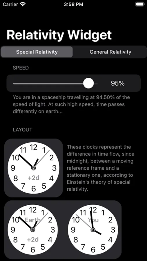 Relativity Widget clocks represent the difference in time flow, since midnight, between a high speed / high gravity experiencing reference frame and a low speed / gravity one, according to Einstein's theory of relativity.