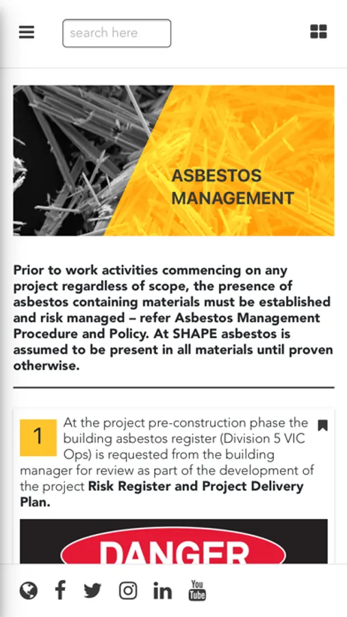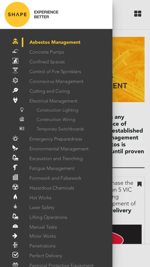 The SHAPE Minimum Standards (SMS) sets out our minimum expectations for all contractors working on SHAPE managed sites for activities set out in the document that the contractor intends to perform. As minimum standards, they are exactly that; the absolute minimum SHAPE expects to be considered and implemented by the relevant trades in performing an activity or process, based on best practice principles. These are generally over and above accepted industry standards whilst maintaining alignment with SHAPE third party certified procedures, Australian Standards, Legislation and Codes of Practice. The SMS has been developed to provide prompt and easy access to the required information via your mobile device. The navigation menu allows for rapid identification and access to the desired subject matter, with each SMS identifying key requirements and example images providing simplistic instructions. Intended as a guidance resource, the SHAPE Minimum Standards material is being made available to assist contractors in developing their SWMS and then in carrying out a referenced activity. Please note the contractor remains solely responsible for developing, managing and carrying out its required package of work in a safe manner. We hope the SMS becomes a useful resource tool for you.