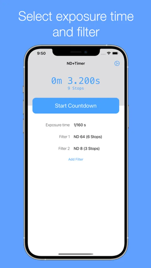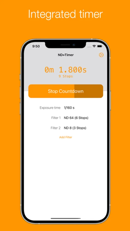 You are on a trip and would like to take a photo of a waterfall? Maybe You would like to take a long time exposure. ND+Timer gives you all the required capabilities to do filter photography. With ND+Timer you can always determine the correct exposure time for your photo. You can use the included timer feature to avoid missing the perfect moment.