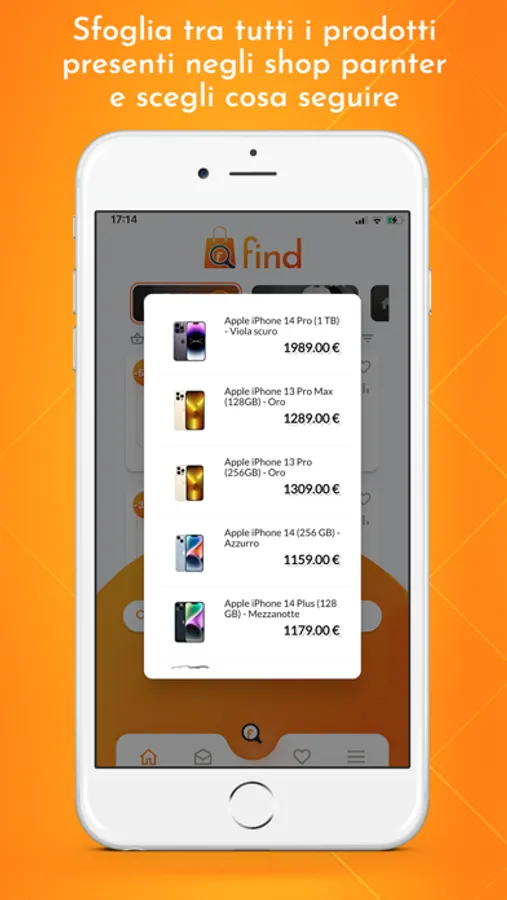 find è il tuo assistente personale di shopping online. Grazie a find sarai in grado di tenere traccia dei prezzi dei prodotti da te desiderati. Seleziona le tue categorie preferite tra le 18 a tua disposizione e comincia da subito a risparmiare. Non sei soddisfatto del prezzo del prodotto? Non preoccuparti, find ti notificherà per tutti i ribassi successivi.