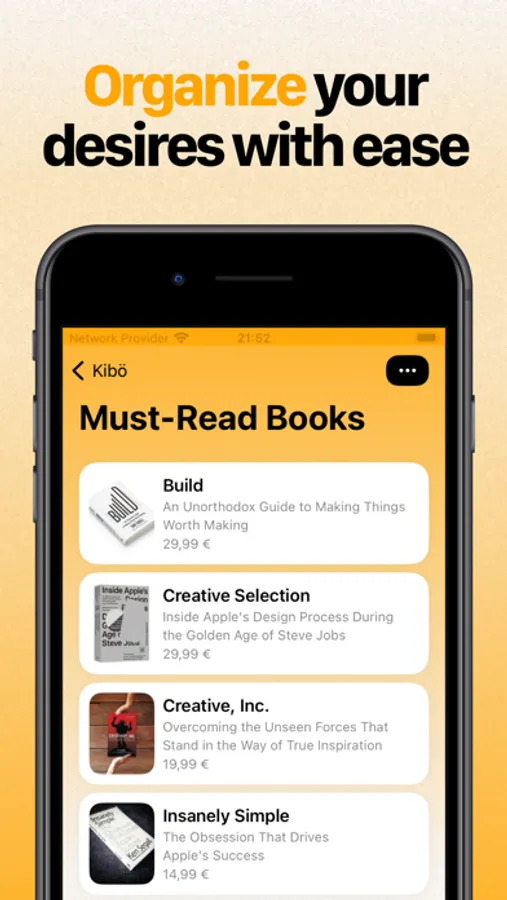 Kibo is a stylish and easy-to-use app that helps you organize your wish lists simply and effectively. With its intuitive design and wide range of features, Kibo becomes your ideal partner to manage all your aspirations and goals.