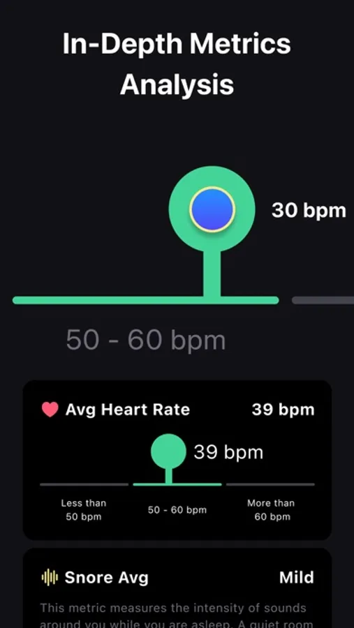 • Heart Rate » Your heart rate analysis is key for measuring your shut eye quality. You can view your sleeping heart rate graph, your average sleeping heart rate, and the dip percentage of your heart rate during sleep